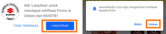 Silahkan klik ‘Lanjutkan’ dan klik ‘Izinkan’. Jika tidak muncul popup message seperti gambar diatas, silahkan lakukan clean history dan setting pada browser anda.
