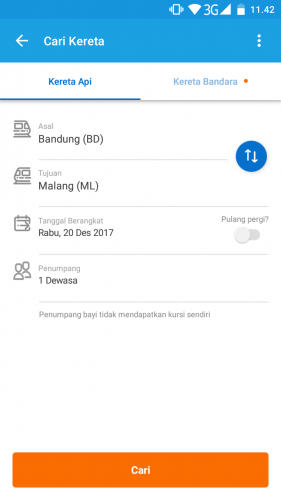 Pilih ikon yang bertuliskan “Tiket Kereta Api” Cari kereta. Masukkan asal kota anda dan tujuan anda beserta tanggal keberangkatan. Lalu isi juga jumlah penumpang. (lihat gambar). Jika sudah silahkan klik/ tab “Cari”.