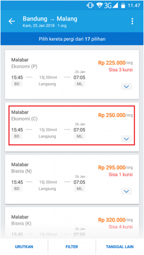 Pilih kereta api yang ingin anda naiki. Ada pilihan ekonomi, bisnis, eksekutif. Pilih saja sesuai selera dan budget anda. Jika sudah memilih, klik kereta yang anda pilih. (lihat gambar)