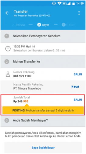 Pada tahap ini, anda di beri waktu beberapa menit (sekitar 30 menit) untuk menyelesaikan pembayaran. Di layar ada batas waktunya dan perhatikan angka total transfernya seperti gambar dibawah ini :